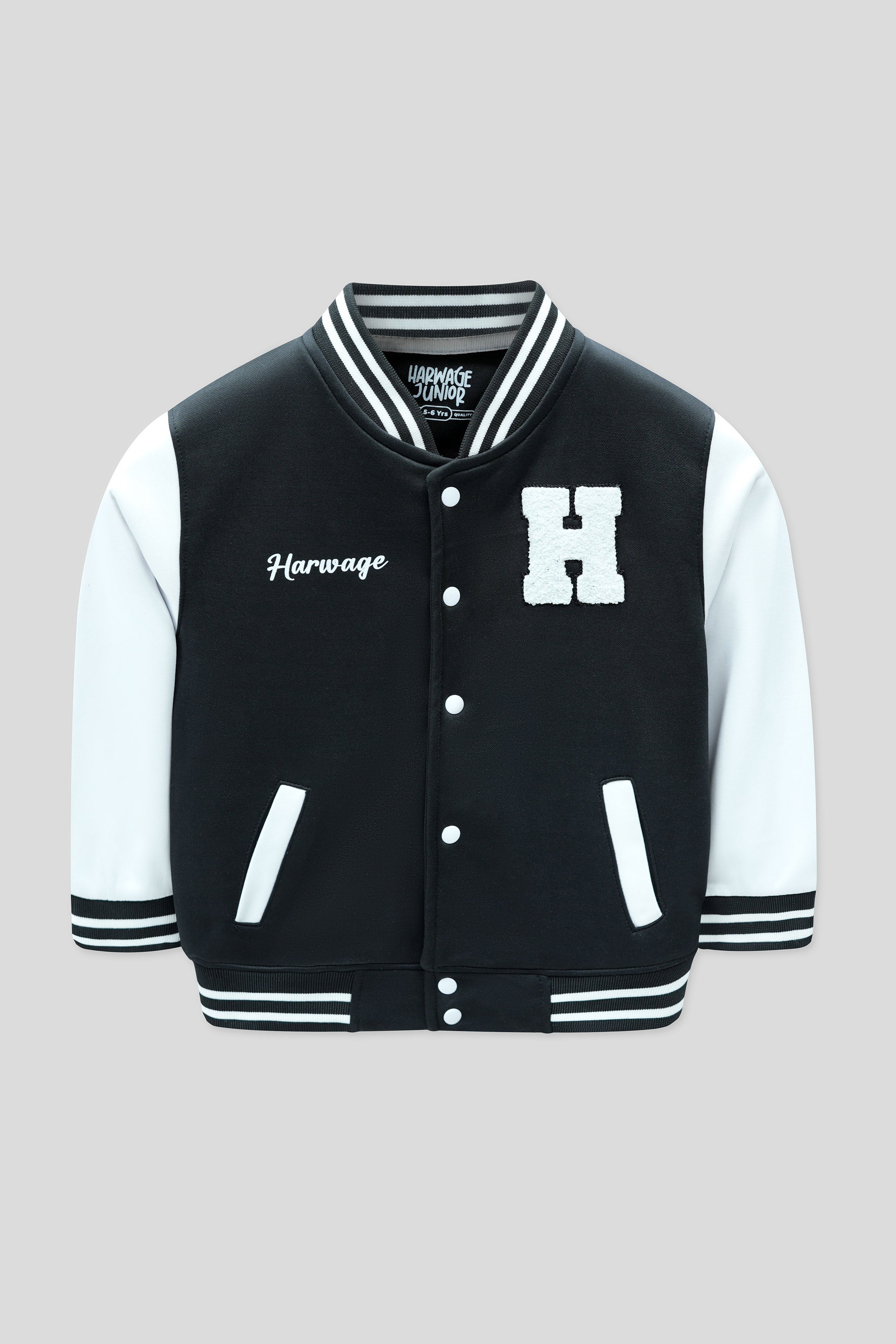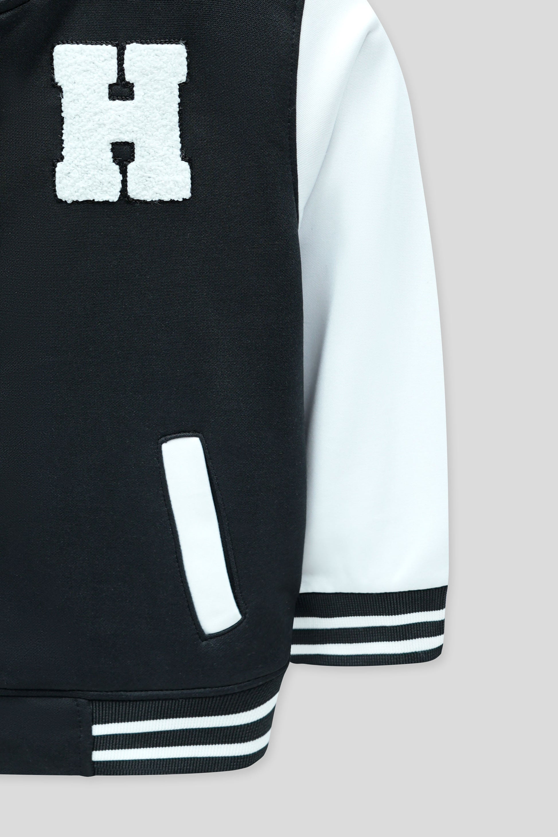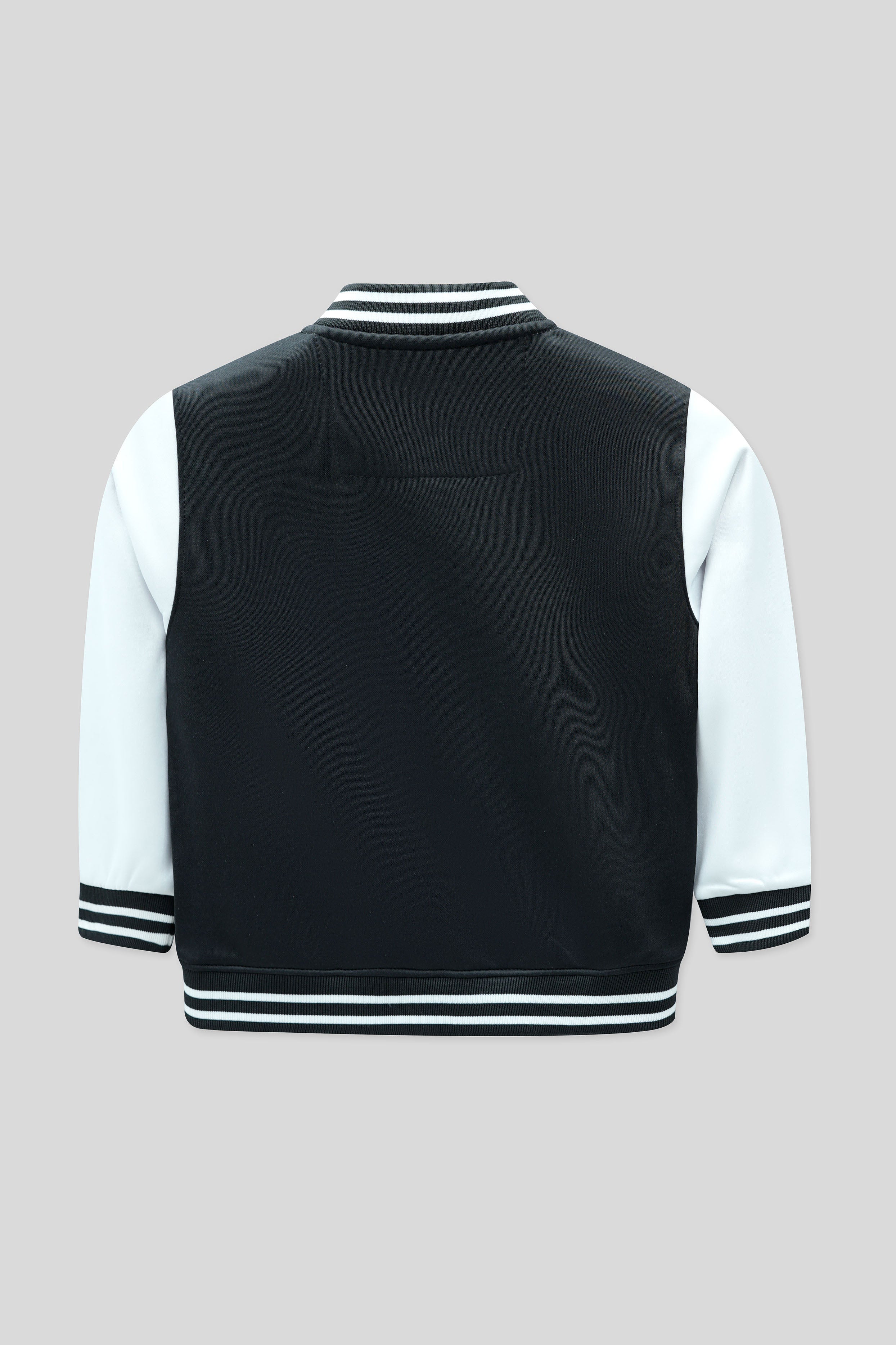 Designed in a classic varsity style, it features contrast ribbed cuffs, collar, and hem for a snug, structured fit, along with a button-up front for easy layering. The sleek black tone adds timeless appeal, making it a must-have piece for every little trendsetter.