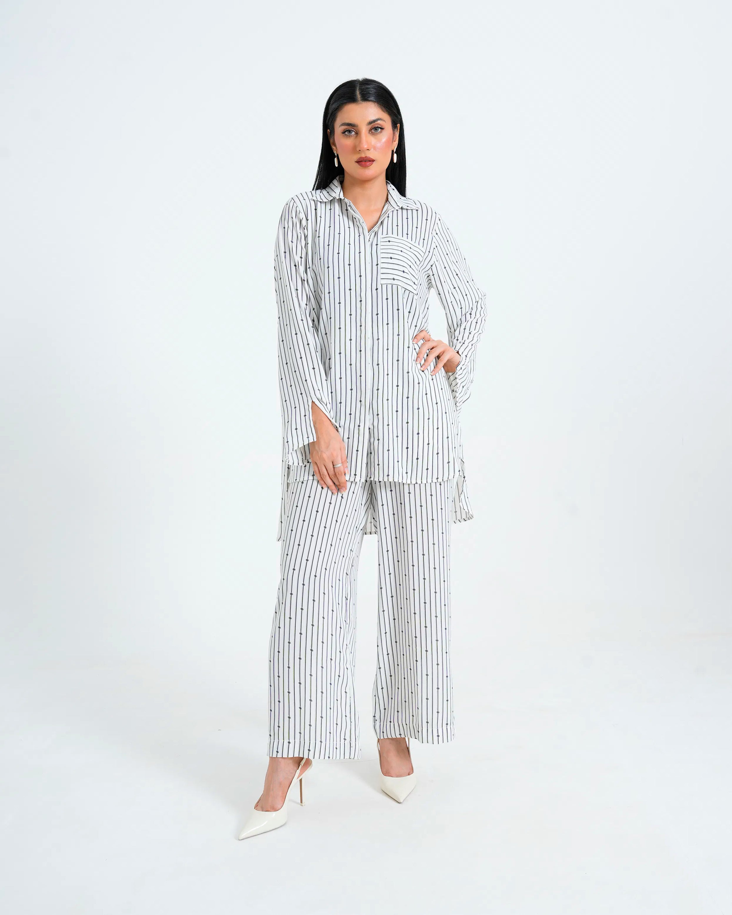 Its clean white tone makes this a versatile white casual co-ord outfit online, easy to style with sandals, flats, or minimal accessories. Whether worn together or styled separately, this set delivers flexibility, making it a smart addition for shoppers looking for a refined yet wearable option in women white co-ord set online Pakistan collections.