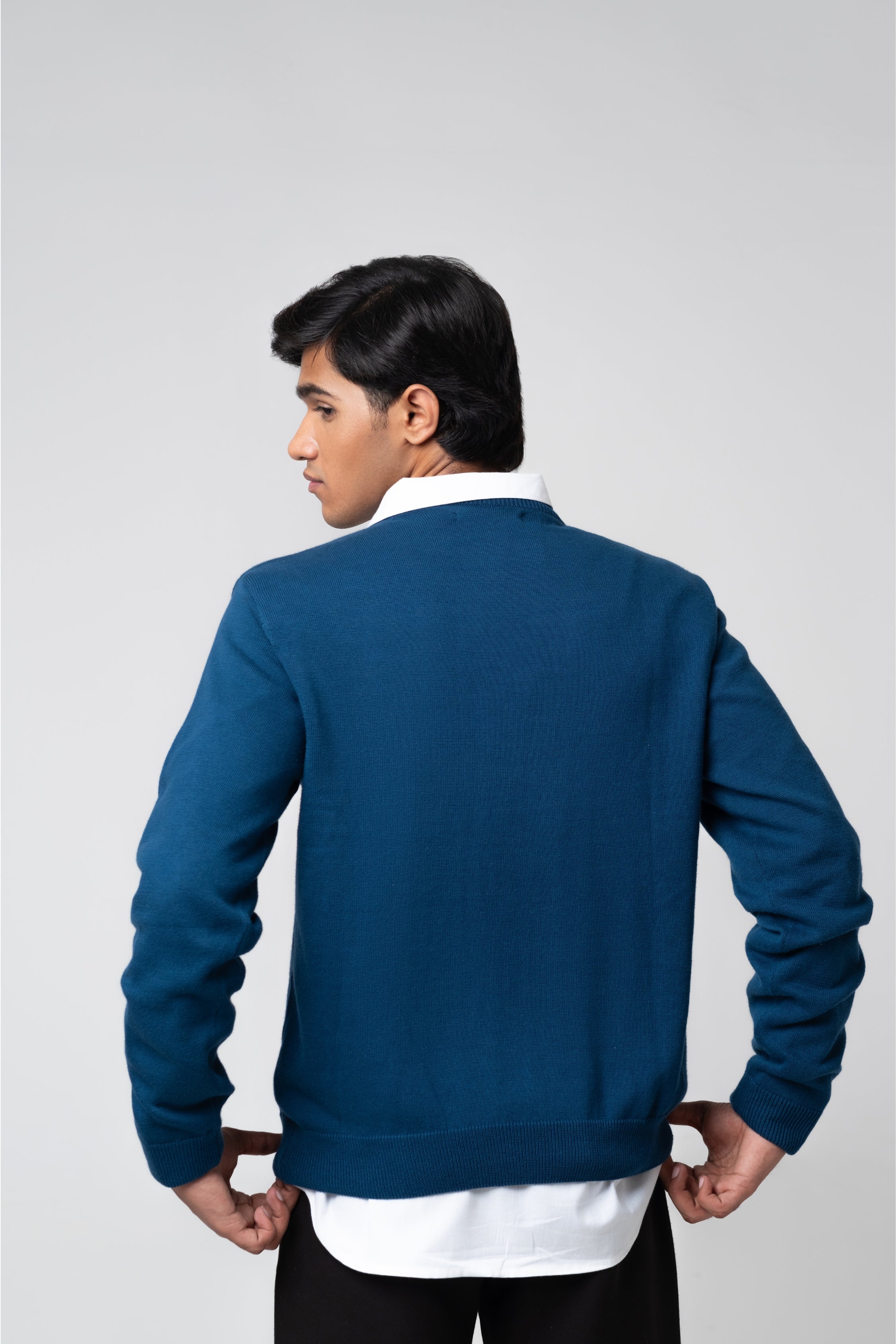 The classic crew neck design ensures a clean, versatile silhouette that pairs easily with shirts, jeans, or chinos. The deep navy color adds a touch of sophistication, making it ideal for both casual and smart-casual wear.