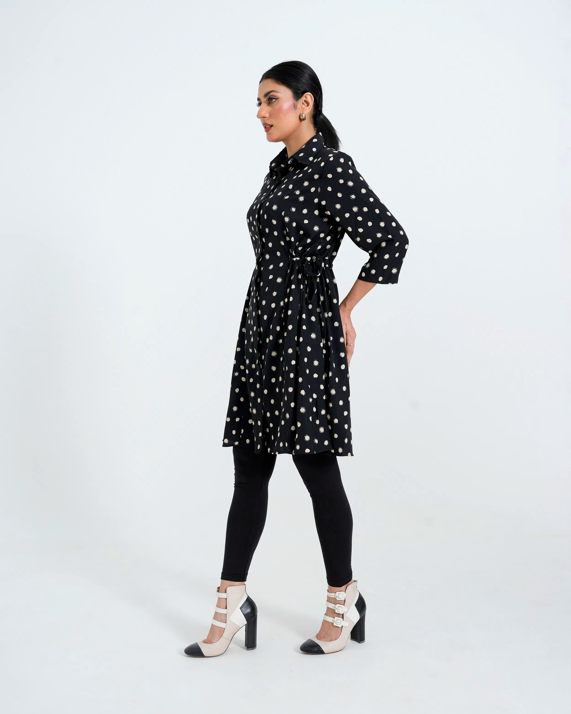 Our model, standing at 5.5 feet, wears a size S, demonstrating the shirt’s versatile and adaptive fit. Pair it with trousers, jeans, or a skirt to create effortlessly chic looks throughout the seasons.