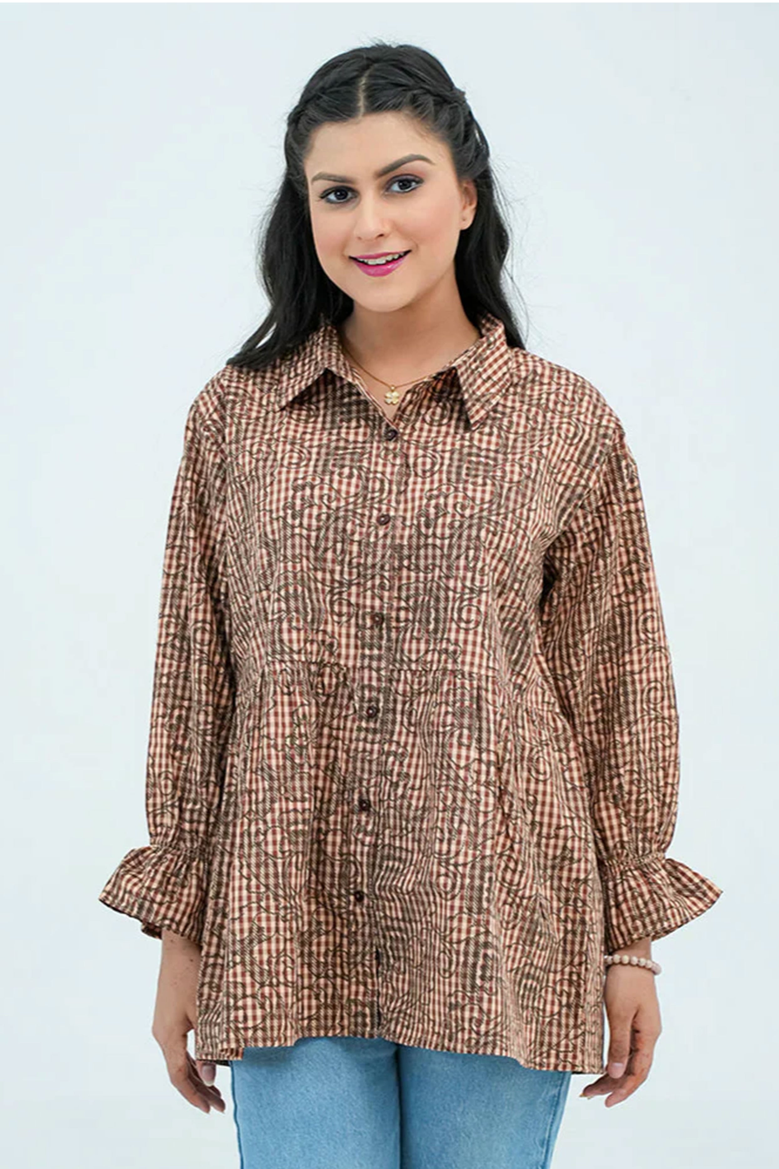 Enhance your wardrobe with our Women’s Brown Checkered Printed Shirt, crafted from 100% cotton for a comfortable and breathable fit. The classic brown checkered print offers a timeless appeal, making it suitable for various occasions, from casual outings to semi-formal events. Designed with a regular fit, this shirt ensures both style and ease of movement.