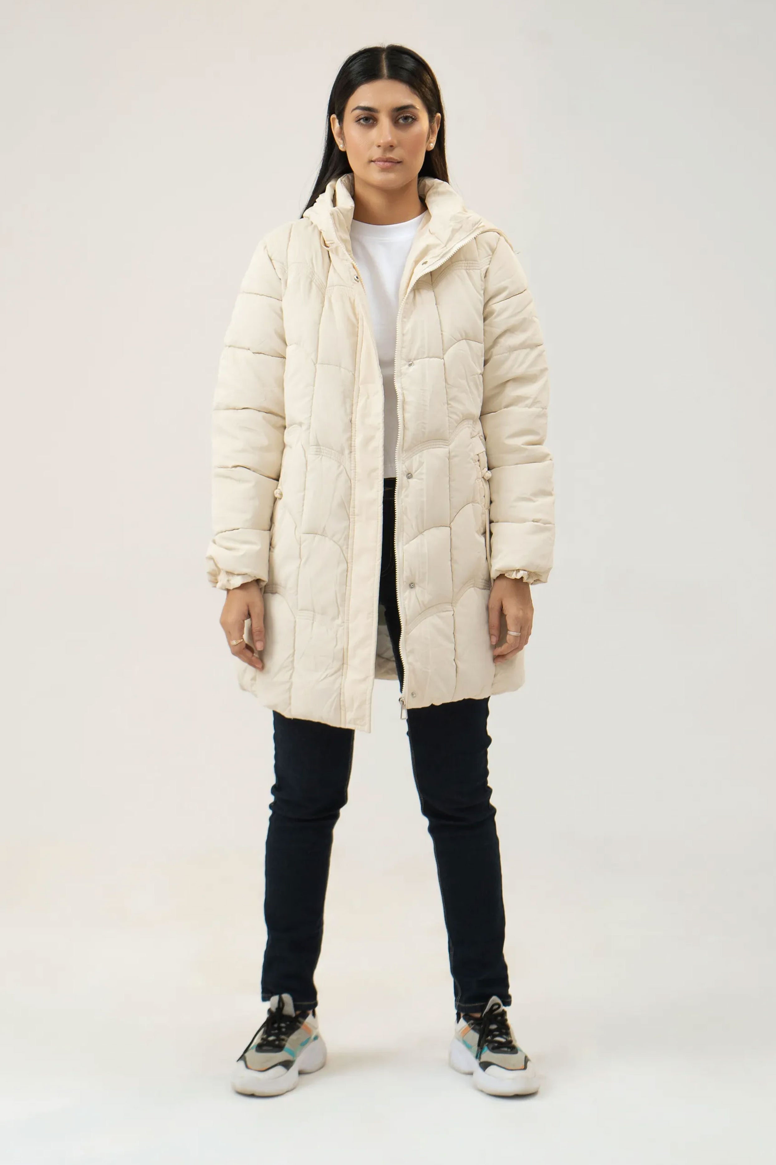 Introducing our Women's Cream Puffer Parachute Jacket, a luxurious addition to your winter wardrobe. Designed with a regular fit, this jacket offers both comfort and style, making it perfect for colder seasons. The elegant cream color adds a touch of sophistication, suitable for various occasions.