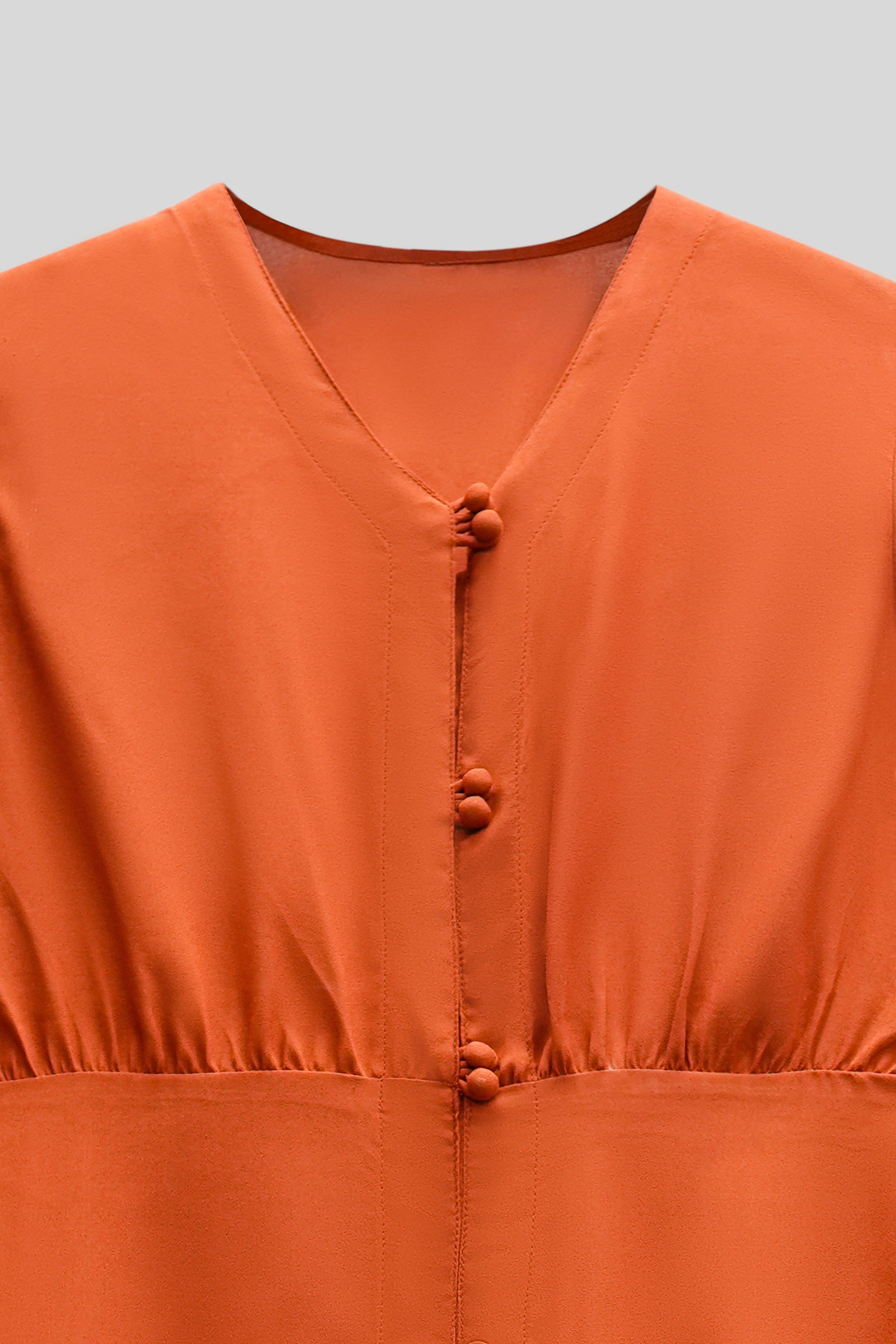 The rust tone adds warmth and sophistication, making it a perfect choice for casual outings, festive occasions, or evening gatherings. Pair it with delicate jewelry and heels for a timeless, graceful look.
